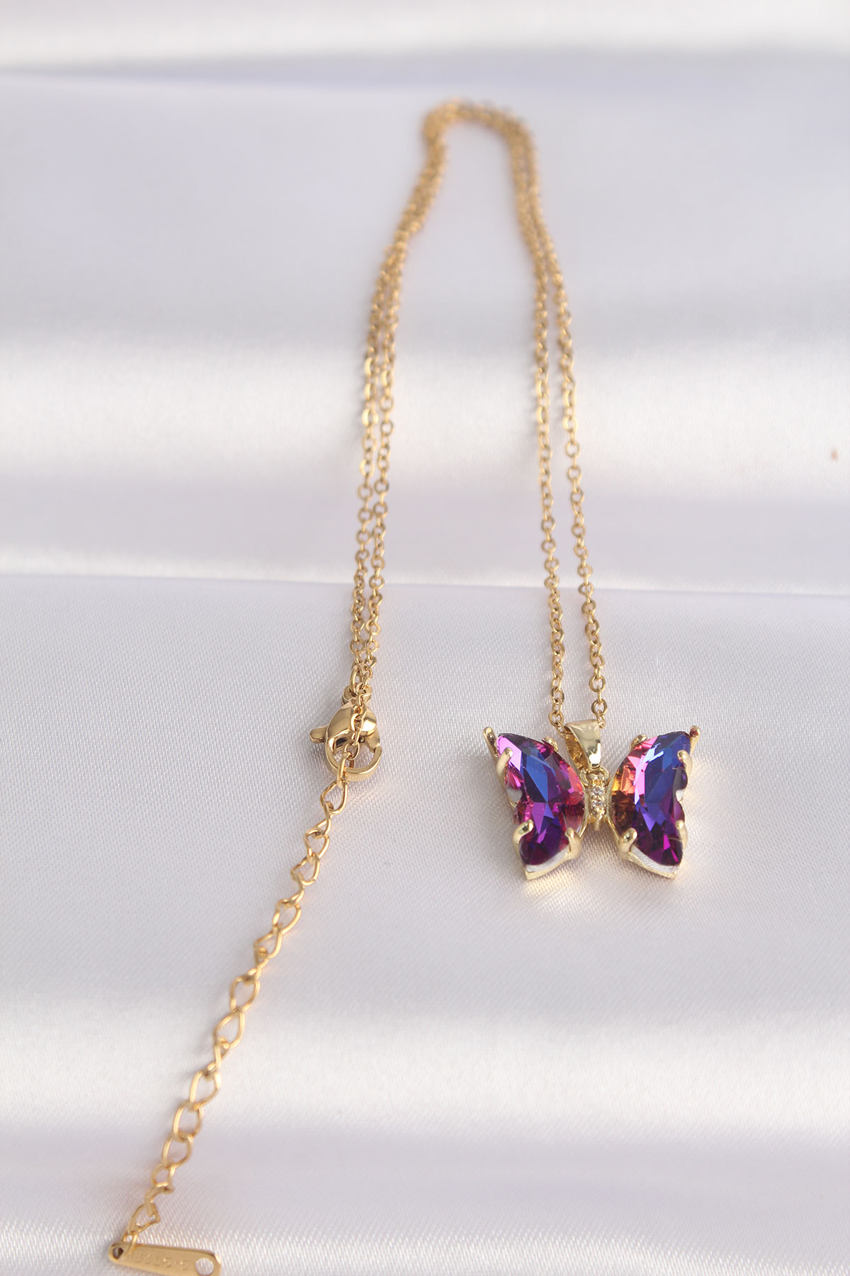 Erb 316L Çelik Zincir Altın Renk Zincir Mor Kelebek Model Renkli Zirkon Taşlı Kolye