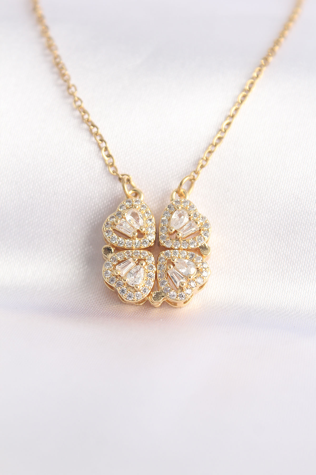 Erb 316L Çelik Zincir Altın Renk Zirkon Taşlı Kalpli Detay Yonca Kolye