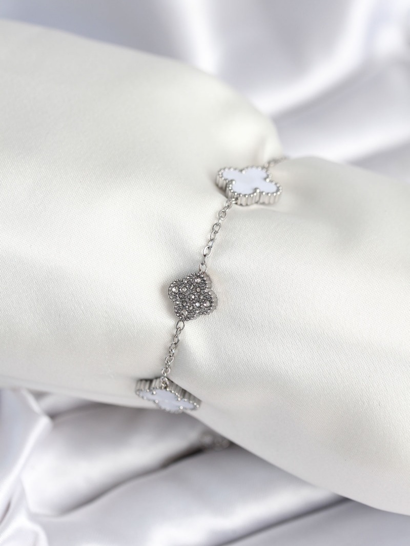 Erb 316L Çelik Zincir Gümüş Renk Zirkon Taşlı Yonca Beyaz Kadın Bileklik