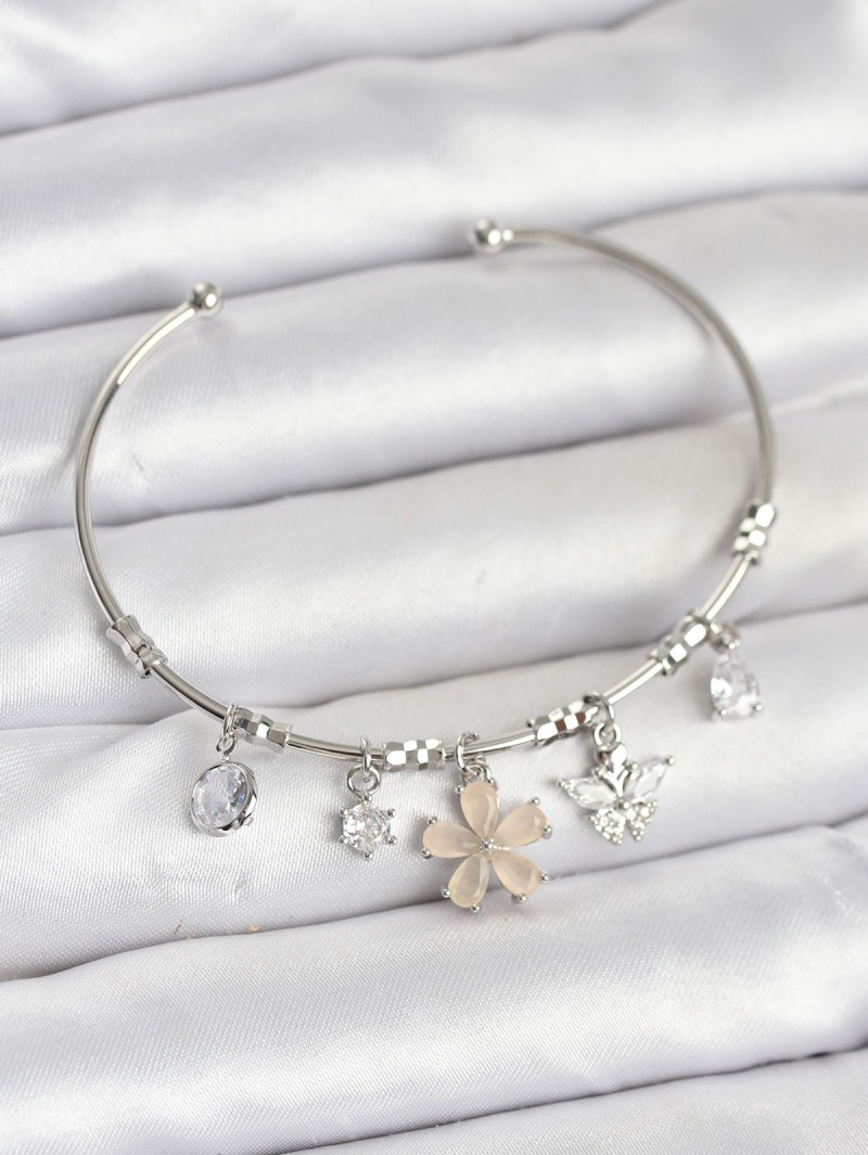 Erb Çiçek Ve Kelebek Charmlı Gümüş Renk Pirinç Kadın Bileklik