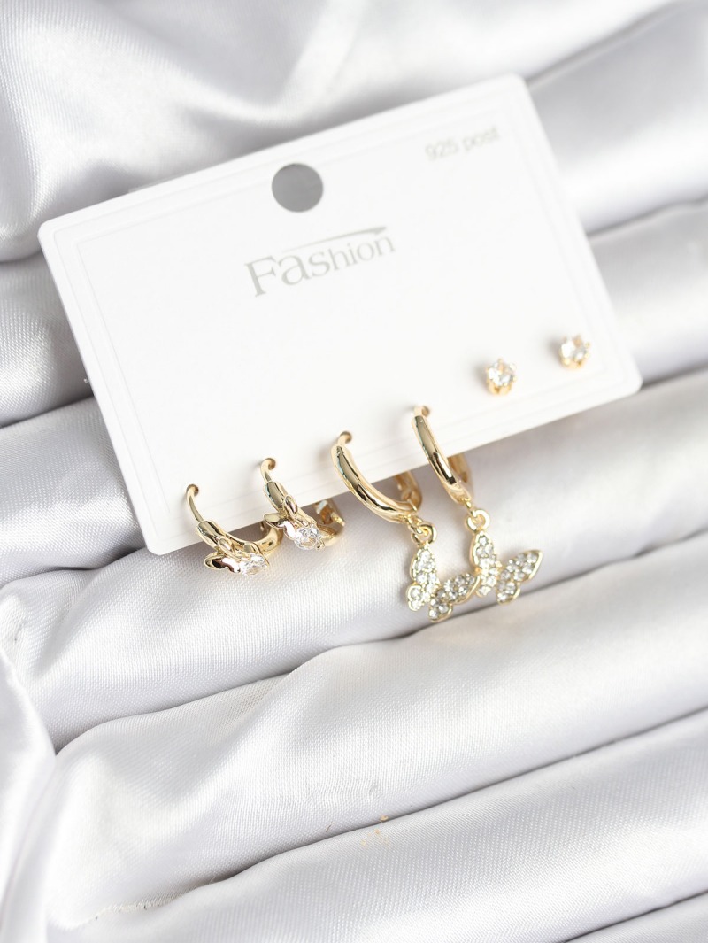 Erb Gold Renk Pirinç Kelebek Model 925 Ayar Gümüş Çivili Kadın Küpe Seti