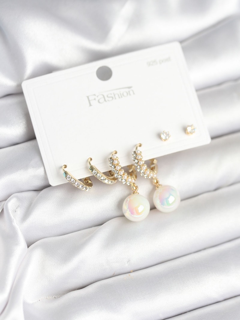 Erb Pirinç Gold Renk İncili 925 Ayar Gümüş Çivi Kadın Küpe Seti