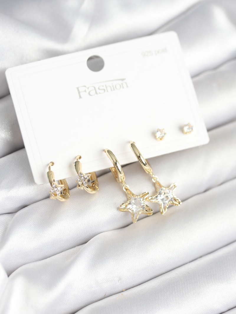 Erb Pirinç Gold Renk Yıldız Model 925 Gümüş Çivili Kadın Küpe Seti