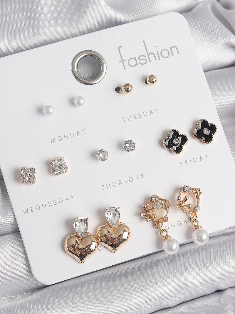 Erb Pirinç Gold Renk Zirkon Taşlı Kalp Figür Siyah Yonca Detay 7 Çift Kadın Küpe Seti