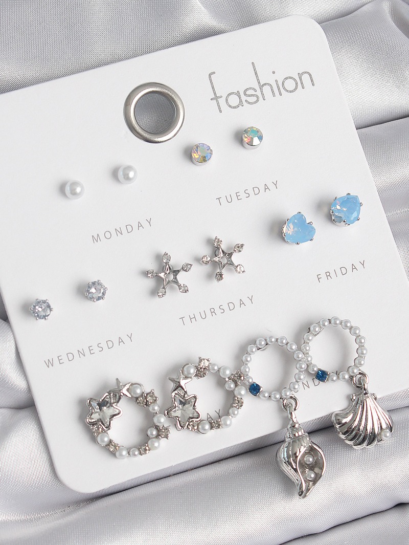 Erb Pirinç Gümüş Renk İncli Zirkon Taşlı Halka Figür Yıldız Detay 7 Çift Kadın Küpe Seti