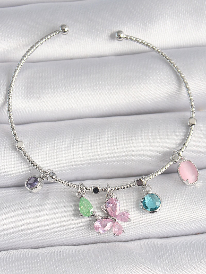 Erb Pirinç Gümüş Renk Pembe Zirkon Taşlı Kelebek Figür Sallantı Detaylı Charm Kadın Bileklik