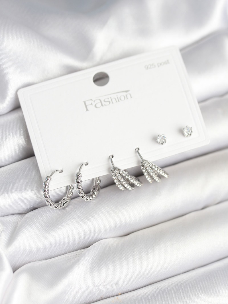 Erb Pirinç Gümüş Renk Zirkon Taşlı 925 Gümüş Çivili Kadın Küpe Seti
