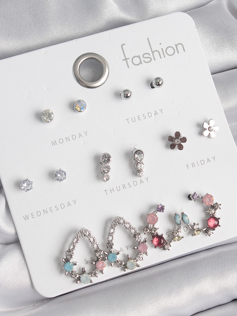 Erb Pirinç Gümüş Renk Zirkon Taşlı Damla Model Çiçek Detay 7 Çift Kadın Küpe Seti