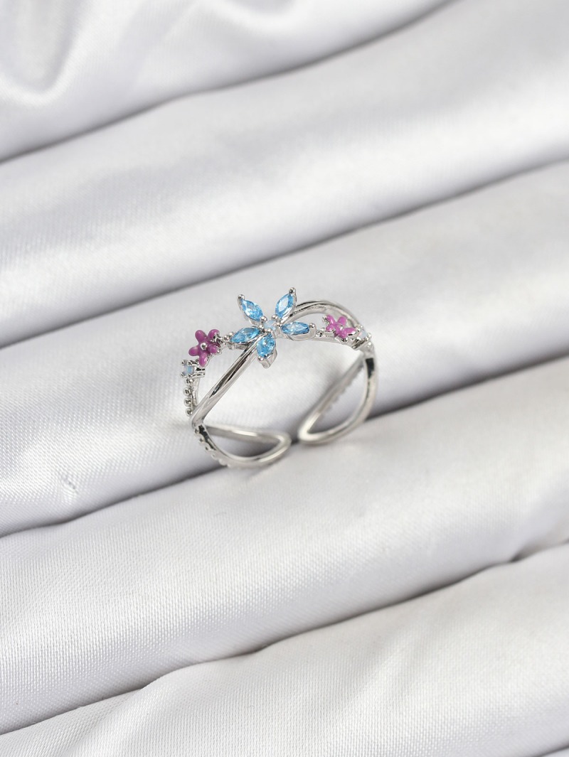 Erb Pirinç Gümüş Renk Zirkon Taşlı Mavi Çiçekli Kadın Yüzük