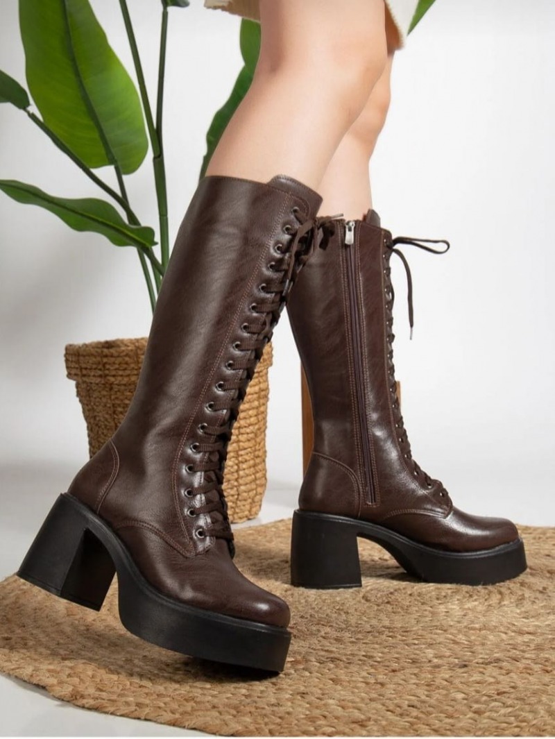 Guay Kahverengi Cilt Bağcıklı Topuklu Çizme